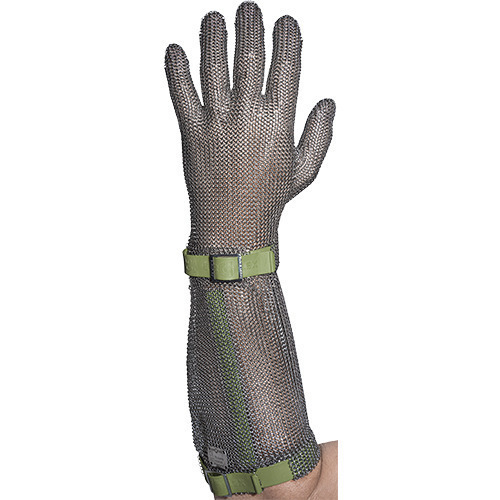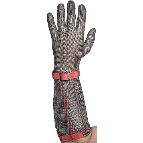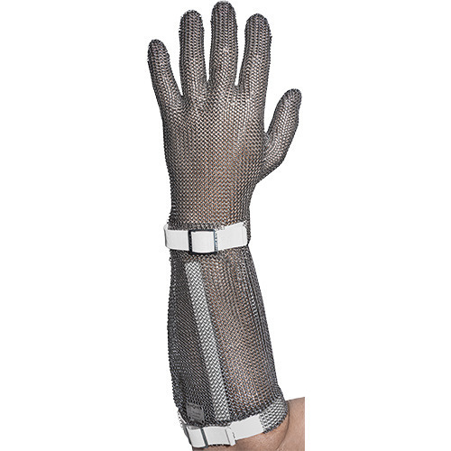Gant de protection en cote de maille. Ce type de gants de protection est recommandé dans l'industrie agro-alimentaire (abattoirs, ateliers de découpe, boucherie). Hygiènique et confortable. Nettoyage et désinfection aisée. Anneaux soudés individuellement. Texture d'anneaux en fil d'acier chrome-nickel de 0,55 mm. Largeur des anneaux 2,9 mm. Bande en caoutchouc/polyester extrêmement résistant, agréable à la peau, hygiènique et imperméable.