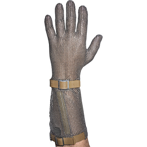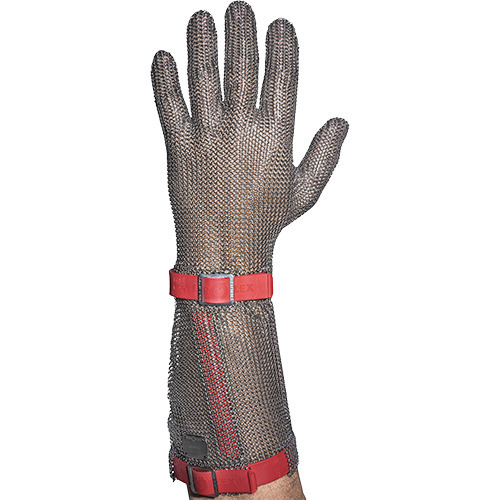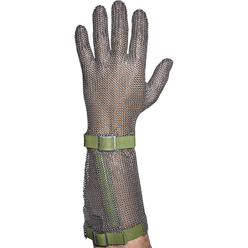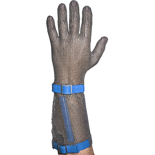 Gant de protection en cote de maille. Ce type de gants de protection est recommandé dans l'industrie agro-alimentaire (abattoirs, ateliers de découpe, boucherie). Hygiènique et confortable. Nettoyage et désinfection aisée. Anneaux soudés individuellement. Texture d'anneaux en fil d'acier chrome-nickel de 0,55 mm. Largeur des anneaux 2,9 mm. Bande en caoutchouc/polyester extrêmement résistant, agréable à la peau, hygiènique et imperméable.