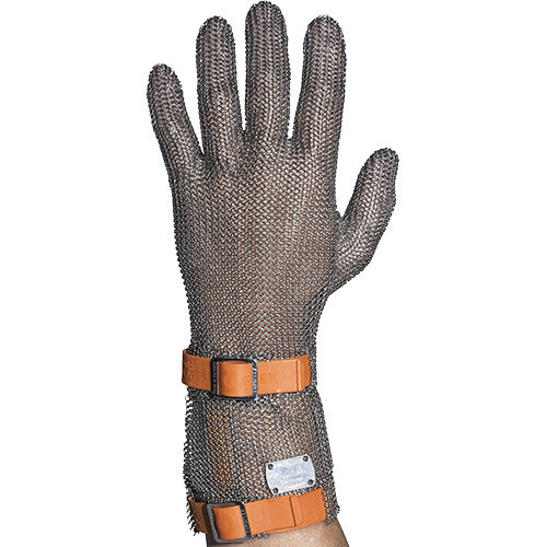 Gant de protection en cote de maille. Ce type de gants de protection est recommandé dans l'industrie agro-alimentaire (abattoirs, ateliers de découpe, boucherie). Hygiènique et confortable. Nettoyage et désinfection aisée. Anneaux soudés individuellement. Texture d'anneaux en fil d'acier chrome-nickel de 0,55 mm. Largeur des anneaux 2,9 mm. Bande en caoutchouc/polyester extrêmement résistant, agréable à la peau, hygiènique et imperméable.